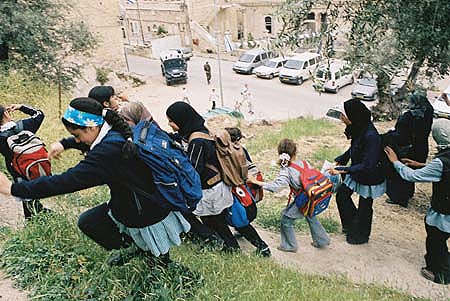 Anak-anak SD Palestina di Al-Khalil ini sedang bergegas karena di kejauhan nampak para pemukim Yahudi sedang mendekati mereka. foto: EAPPI