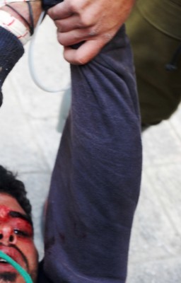 Ibrahim Saadi diseret dalam keadaan kepalanya berdarah ditembak serdadu zionis Jum’at lalu. Sampai kini belum ada kejelasan kondisinya di penjara. foto: Occupied Palestine