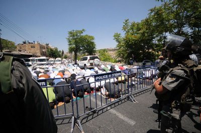 Setiap Jum’at, ribuan orang dicegah shalat Jum’at di Masjidil Aqsha oleh serdadu-serdadu zionis. Mereka terpaksa shalat di berbagai sudut depan pintu-pintu gerbang masjid suci itu, di depan serdadu-serdadu Yahudi. foto: Demotix