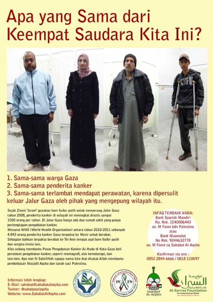 Fayoumi dan Taweel mengaku tidak minta dikasihani. Keduanya menegaskan, seperti kebanyakan orang mereka tetap bisa bekerja serta membesarkan anak-anak. Hanya saja, minimnya perlengkapan medis untuk mengobati dan merawat ribuan pasien kanker di Jalur Gaza memang masih jadi kendala.* (Occupied Palestine | Sahabat Al-Aqsha)