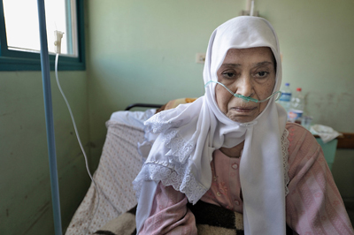 Fatimah Al-Dallou, 62 tahun, pasien kanker payudara duduk di ranjangnya di bangsal onkologi RS Al-Syifa, kota Gaza. foto: Jeffery/Photo Shelter