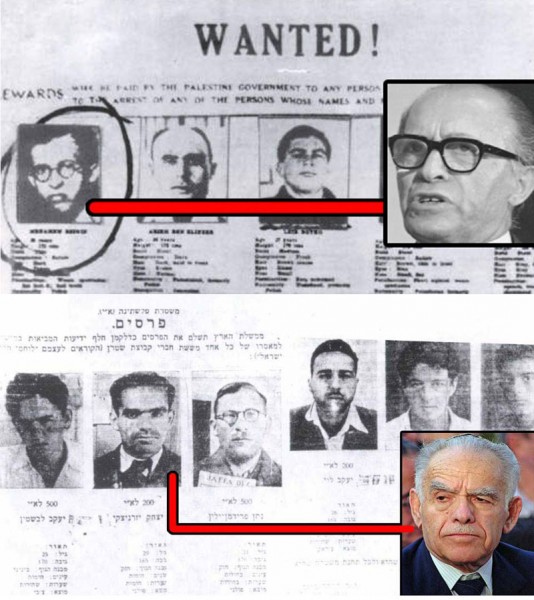 Pengumuman kepolisian Palestina tentang para pelaku pembantaian Deir Yassin. Yang dilingkari (atas) adalah Menachem Begin, kepala gerombolan Irgun (yang kelak jadi perdana menteri zionis). Begitu juga kepala gerombolan Lehi Yitzak Shamir (bawah). Keduanya adalah pemimpin gerombolan teroris yang kemudian jadi pejabat-pejabat tertinggi negara palsu ‘israel’. foto: Balder/Norway, redesain: Sahabat Al-Aqsha