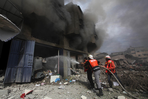 Pemadam kebakaran dari Direktorat Pertahanan Rakyat berusaha padamkan api akibat bom-bom yang dijatuhkan penjajah zionis 18 Nopember 2012 lalu. foto: APA