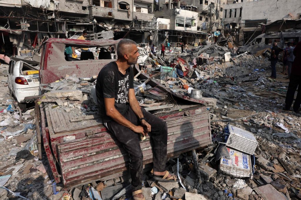 Seorang pria duduk di tengah-tengah bangunan yang hancur setelah serangan ‘Israel’ di kamp pengungsi Al-Shati di Kota Gaza, Palestina, 28 Oktober 2023. Foto: AFP