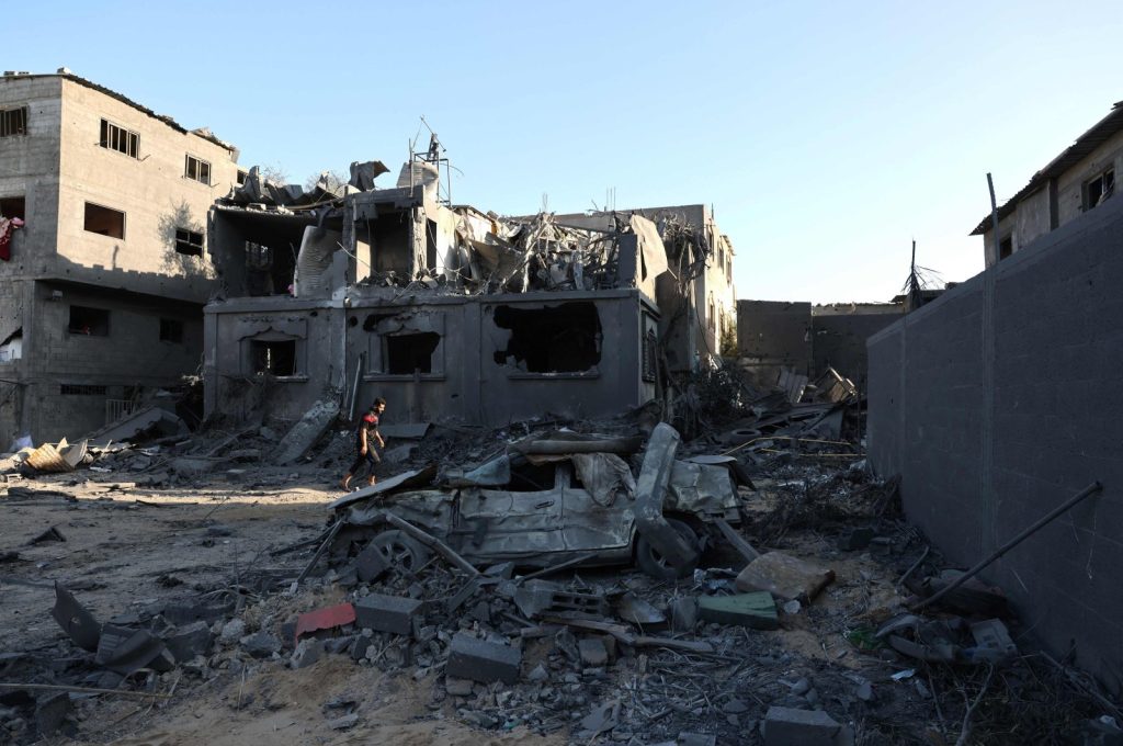 Seorang pria Palestina berjalan melewati rumah dan kendaraan yang hancur sehari setelah serangan udara ‘Israel’ di kamp pengungsi Nuseirat, di tengah Jalur Gaza, Palestina, 30 Oktober 2023. Foto: AFP