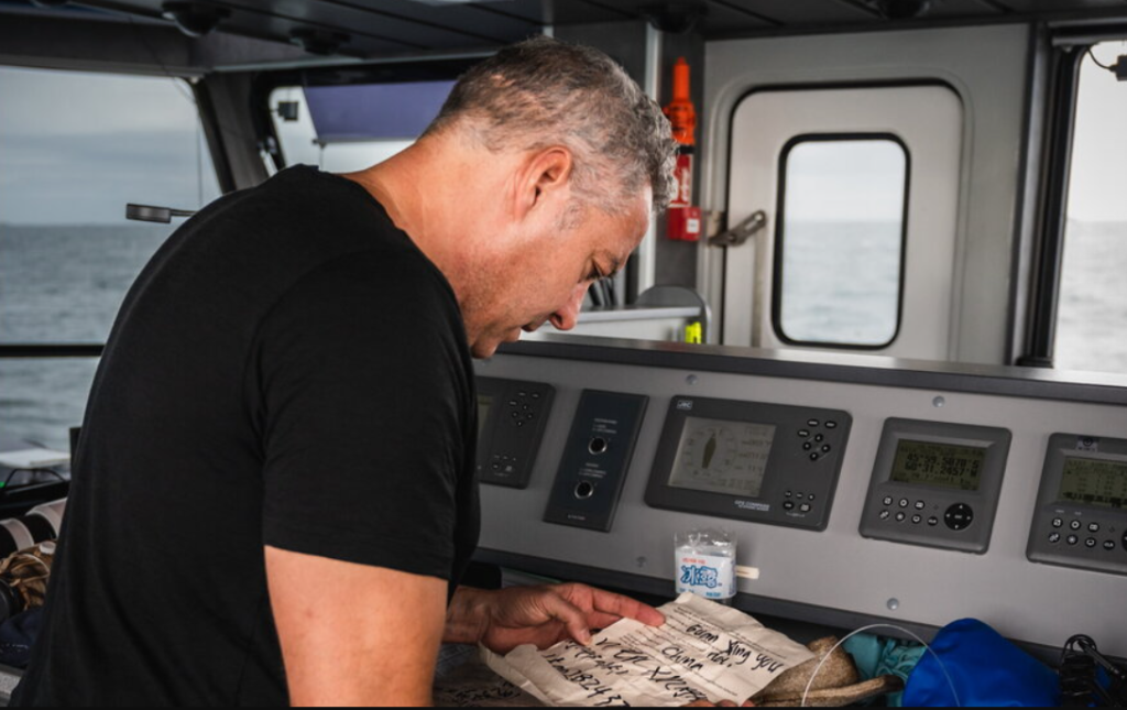 Ian Urbina dari Ocean Outlaw Project membacakan kuesioner yang dia lemparkan ke kapal penangkap ikan Tiongkok untuk diisi oleh awak kapal. (Youenn Kerdavid/Sea Shepherd Global)