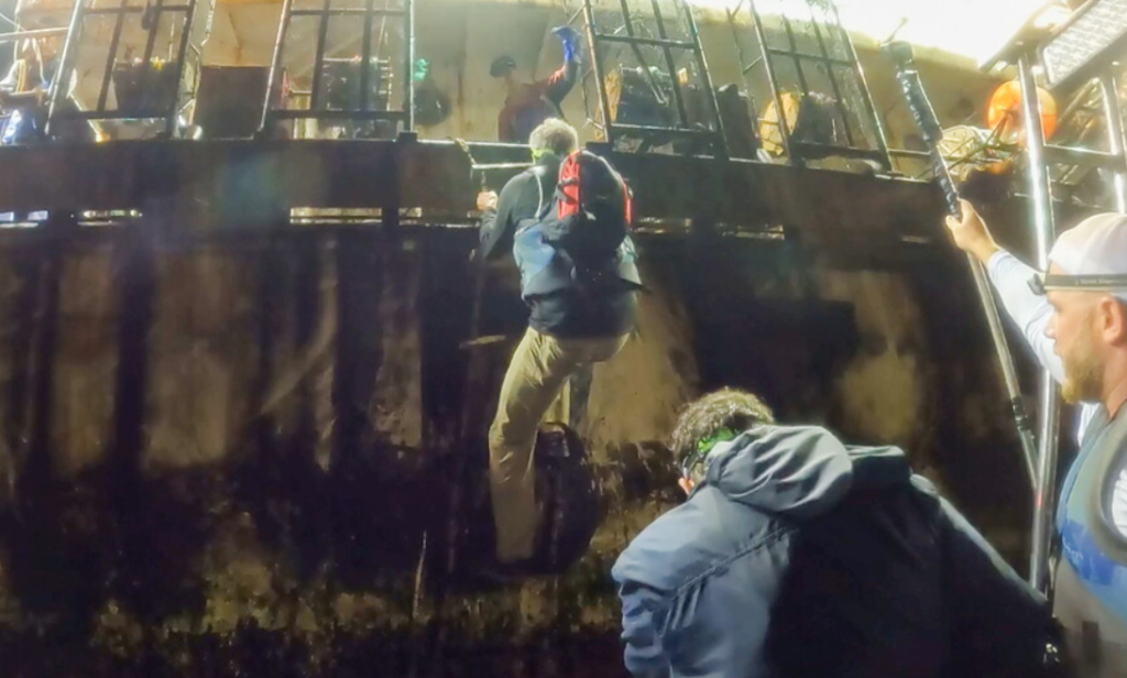 Anggota tim dokumenter AS yang menyelidiki pelanggaran HAM di laut menaiki kapal penangkap ikan. Outlaw Ocean Project menyatakan bahwa ikan yang ditangkap oleh armada penangkapan ikan Cina, tempat para pekerjanya mengalami kondisi yang keras, berakhir di pasar swalayan Irlandia. (The Outlaw Ocean Project)