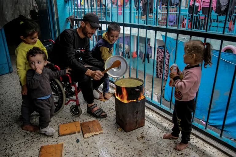 Seorang pria Palestina memasak dikelilingi oleh anak-anak di sekolah UNRWA yang digunakan sebagai tempat berlindung di Kota Gaza pada 27 November. Foto: Omar El-Qattaa/AFP