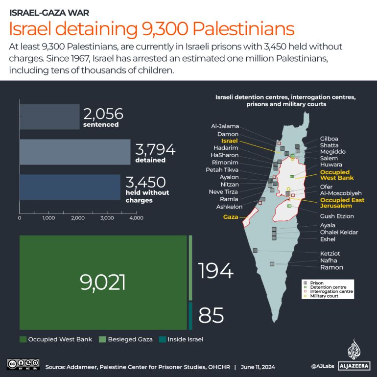 ‘Israel’ saat ini menahan sedikitnya 9.300 warga Palestina, termasuk 3.450 orang yang ditahan tanpa tuduhan dan proses “peradilan”.