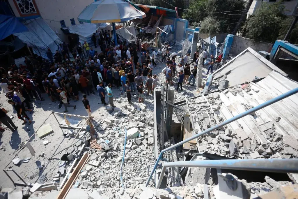 Warga Palestina memeriksa tenda dan tempat perlindungan darurat yang hancur setelah serangan ‘Israel’ menghantam sekolah UNRWA, menewaskan dan melukai banyak orang di Kamp Pengungsi Nuseirat di Deir al-Balah, Gaza, pada 14 Juli 2024. [Ashraf Amra – Anadolu Agency]
