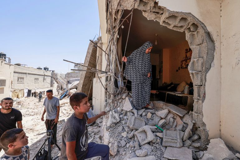 Warga memeriksa sebuah rumah yang rusak akibat serangan udara penjajah zionis laknatullah di Kota Jenin. (Jaafar Ashtiyeh/AFP)