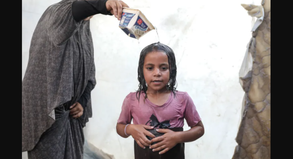 “Anak-anak saya menangis sepanjang hari karena kepanasan,” lanjutnya, menjelaskan bagaimana kulit mereka menderita akibat paparan sinar matahari terus-menerus, kurangnya produk kebersihan, dan kelangkaan air. Air yang mereka gunakan untuk mandi dan minum diambil oleh anak-anaknya dari rumah sakit terdekat.
