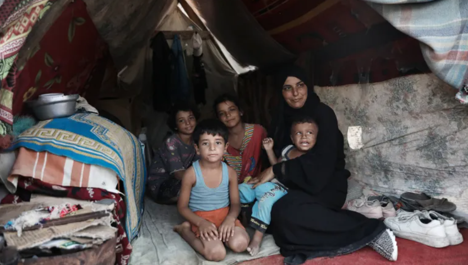 Nimah Elyan, 45 tahun, beserta ketiga anaknya di sebuah tenda di kamp pengungsian Deir el-Balah, tempat mereka tinggal sejak bulan Maret (Abdelhakim Abu Riash/Al Jazeera)