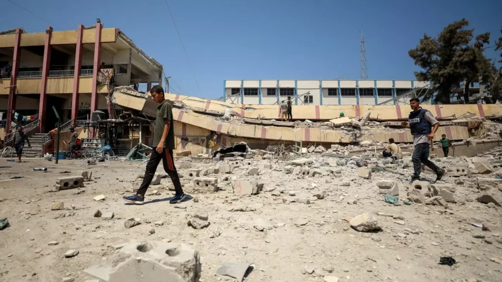 Warga Palestina memeriksa sekolah yang menampung orang-orang yang mengungsi setelah terkena serangan ‘Israel’ di Kota Gaza pada 20 Agustus 2024 (Reuters/Dawoud Abu Alkas)