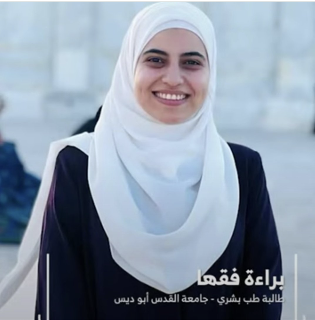Pada 14 Agustus 2024, serdadu ‘Israel’ menculik mahasiswa kedokteran Bara’a Fuqaha, 24 tahun, di sebuah pos pemeriksaan dekat Nablus dan menjatuhkan hukuman enam bulan penjara kepadanya. Dia sebelumnya diskors dari Universitas al-Quds selama enam bulan karena kegiatan serikat mahasiswa.