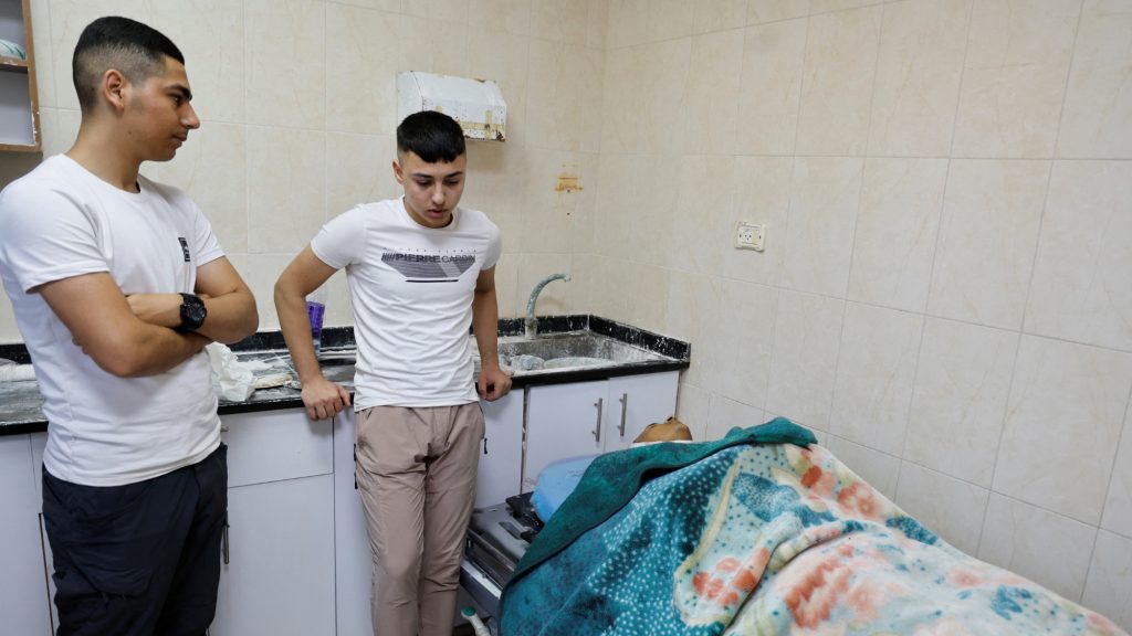 Warga berdiri di samping jenazah seorang warga Palestina, yang terbunuh dalam serangan “Israel” di kamp al-Far’a, di sebuah rumah sakit di Tubas, di Tepi Barat terjajah pada 28 Agustus 2024. Foto: Raneen Sawafta/Reuters