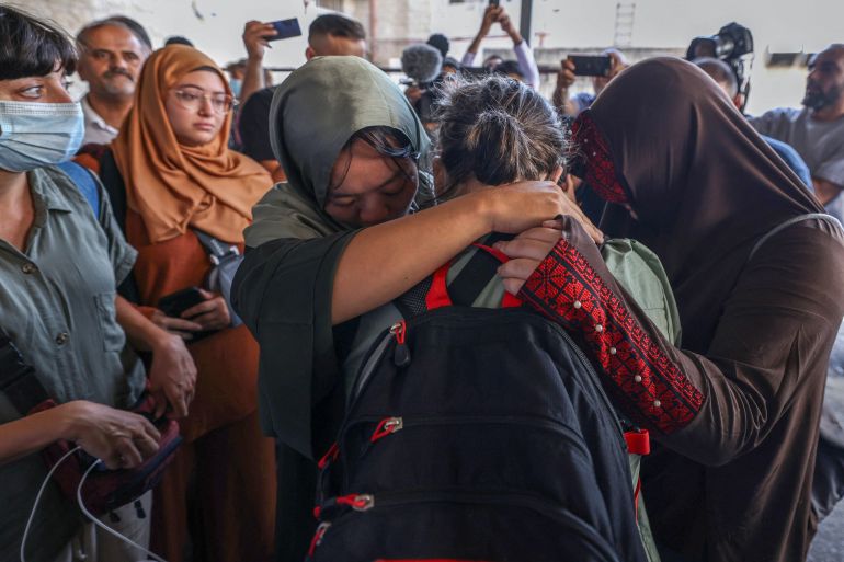 Warga Palestina dan aktivis internasional saling menguatkan ketika mereka menghantarkan jenazah aktivis Turkiye-Amerika yang dibunuh penjajah zionis, Aysenur Ezgi Eygi, pada hari Ahad (8/9/2024). (Jaafar Ashtiyeh/AFP)