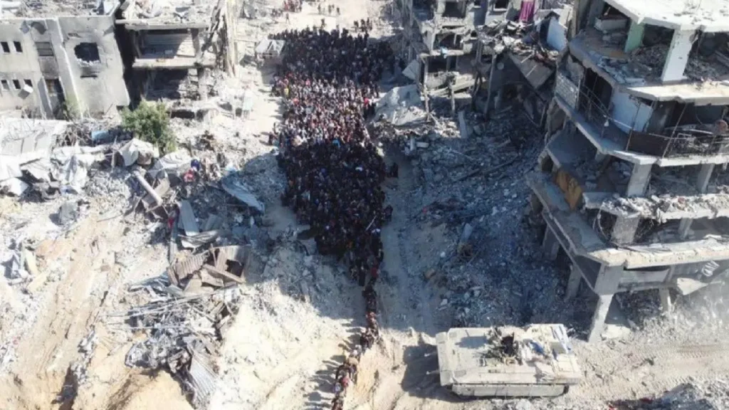 Sebuah video dari lembaga penyiaran “Israel” menunjukkan kerumunan orang yang diusir dari kamp pengungsi Jabalia yang terkepung saat berupaya melewati pos pemeriksaan.