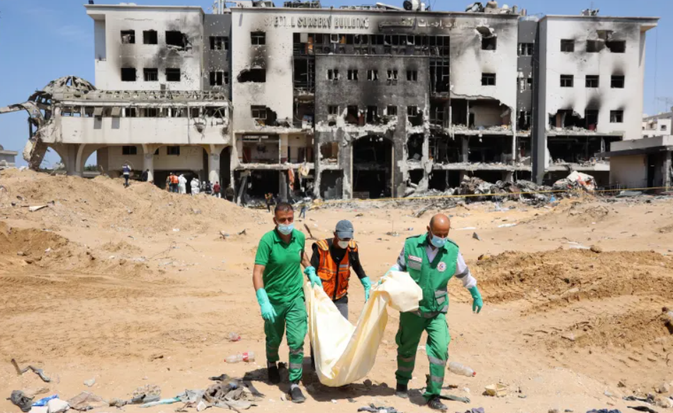 Penjajah zionis membunuh lebih dari 400 pasien Palestina, dokter, perawat, dan warga sipil; yang jenazahnya dikubur di galian tanah yang dangkal di halaman rumah sakit Al-Shifa.