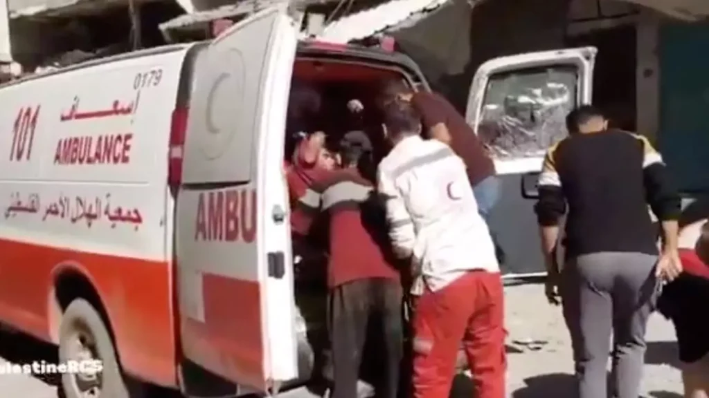 Tim Bulan Sabit Merah Palestina mengangkut orang-orang yang terluka di Jabalia, Gaza, dalam tangkapan layar dari video, 22 Oktober 2024 (PRCS via Reuters)