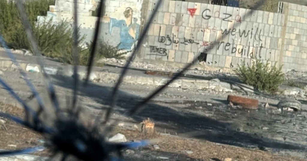 Tulisan “Gaza, kami akan membangunnya kembali” terlihat melalui jendela yang pecah di Kota Gaza. (Olga Cherevko/OHCHR OPT)