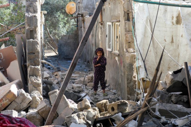 Seorang anak perempuan Palestina memeriksa kerusakan di lokasi serangan “Israel” terhadap sebuah rumah di Deir el-Balah di Jalur Gaza tengah pada 25 Maret 2025 [Ramadan Abed/Reuters]