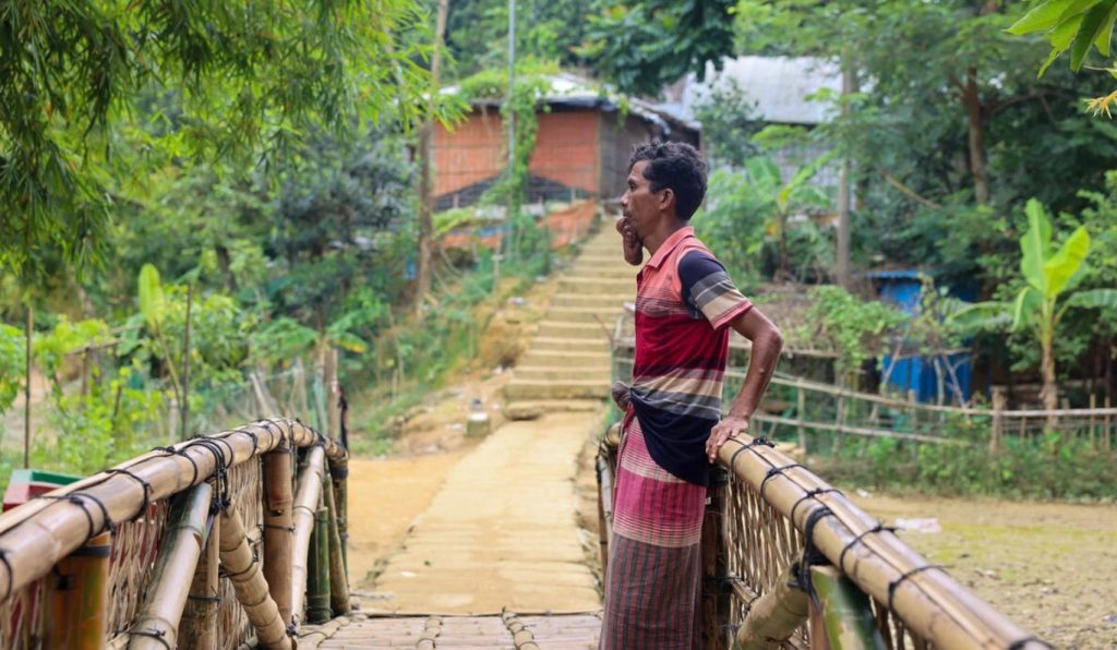 Jahid Alam berdiri di atas jembatan yang dibangun oleh para muhajirin sebagai bagian dari program PBB yang dijalankan oleh komunitas tersebut. (UNHCR/Shagufta Shathy)