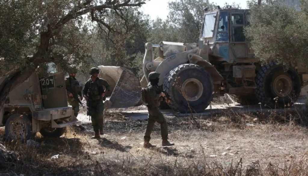 Buldoser ‘Israel’ menghancurkan bangunan dan infrastruktur milik warga Palestina. Kendaraan militer berpatroli di jalan-jalan saat penjajah ‘Israel’ menyerang Jenin dan kamp pengungsi di bagian utara Tepi Barat pada 17 Juli 2025. [Nedal Eshtayah – Anadolu Agency]