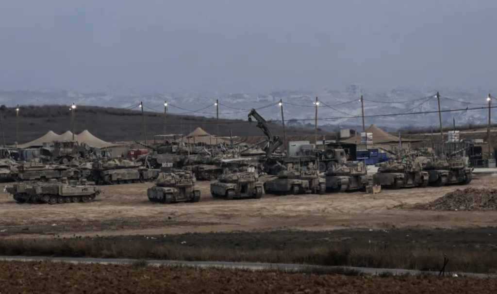 Gambar yang diambil dekat pagar pembatas Gaza menunjukkan pergerakan tank dan kendaraan lapis baja penjajah ‘Israel’ yang menyerang Gaza tanpa henti pada 10 Agustus 2025. [Tsafrir Abayov – Anadolu Agency]