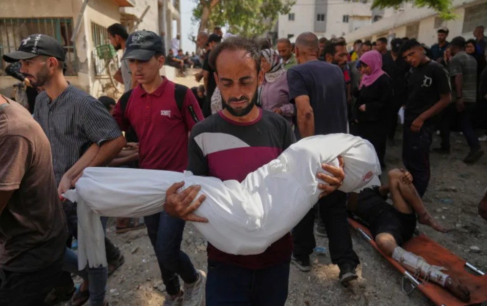 Seorang pria Gaza menggendong jenazah keponakannya yang masih berusia tujuh tahun yang tewas akibat serangan udara ‘Israel’ di Rumah Sakit al-Shifa, Kota Gaza, 16 Agustus 2025. (Jehad Alshrafi/AP)