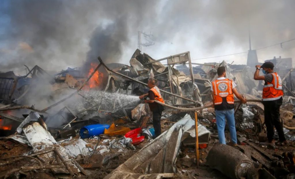 Tim Pertahanan Sipil Palestina dan warga sipil merespons kebakaran besar yang terjadi setelah serangan udara ‘Israel’ di bagian tengah Kota Deir al-Balah, Gaza, pada 21 Agustus 2025. [Mohammed Nassar – Anadolu Agency]