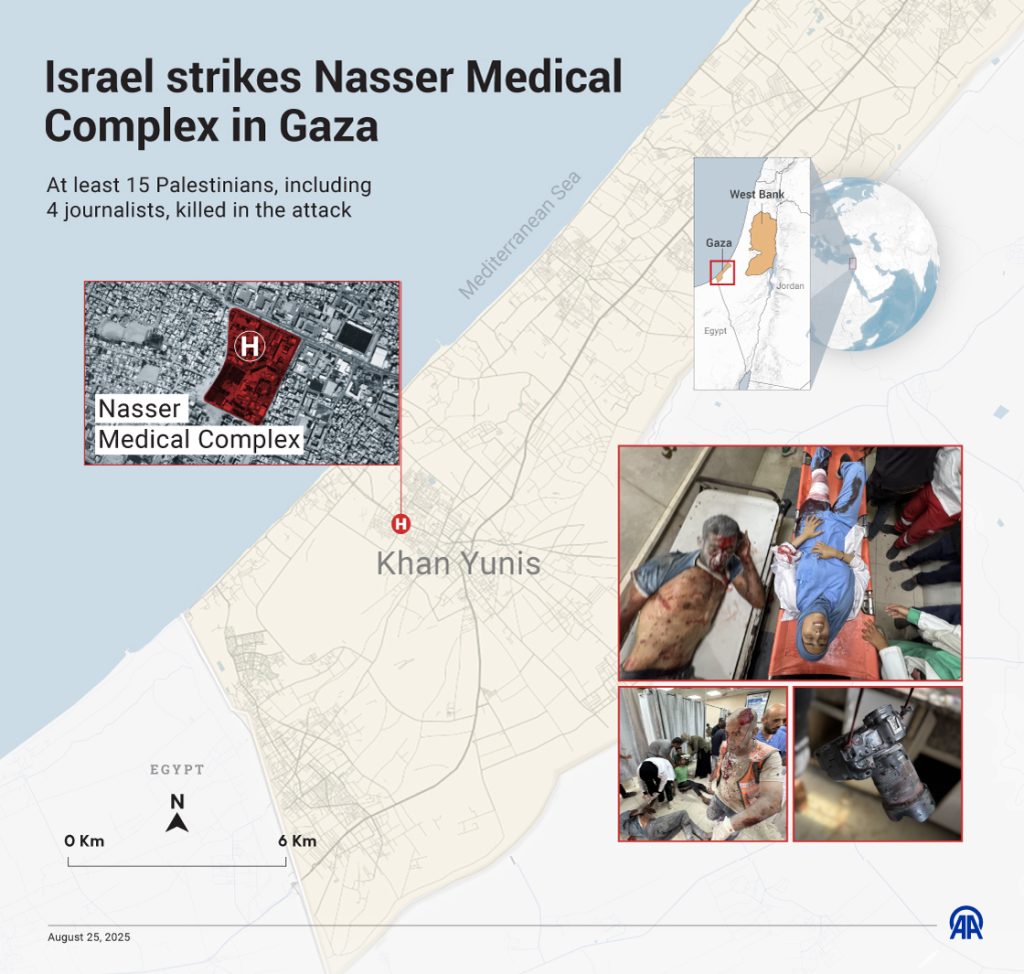 ISTANBUL (Anadolu Agency) – Dua puluh warga Palestina—termasuk lima jurnalis dan seorang petugas pemadam kebakaran—gugur serta beberapa lainnya terluka pada hari Senin (25/8/2025) akibat serangan ‘Israel’ terhadap Kompleks Medis Nasser di Khan Yunis, bagian selatan Jalur Gaza.