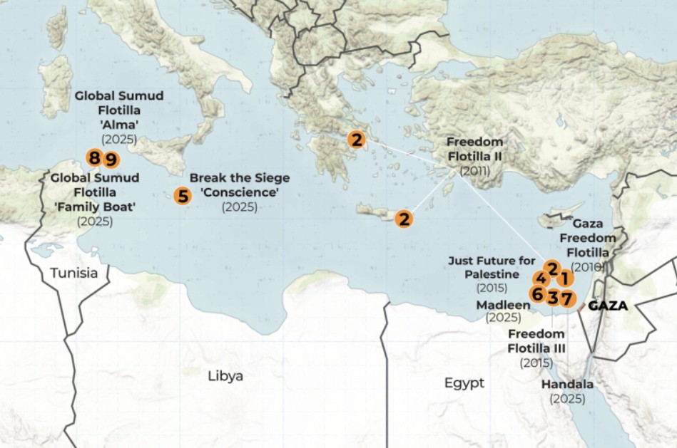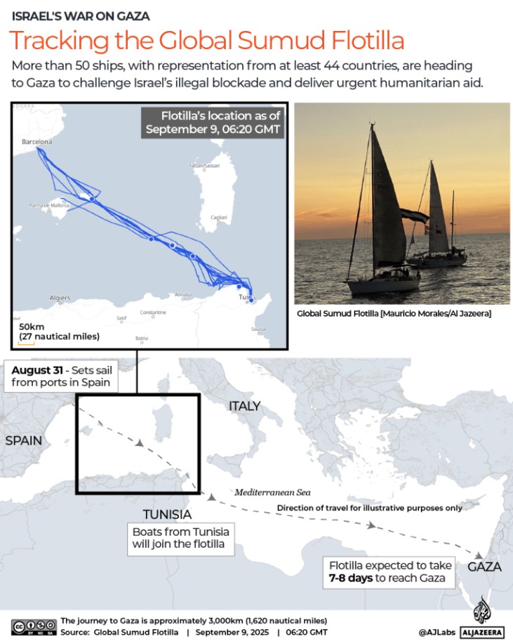 GSF, sebuah koalisi yang terdiri dari lebih dari 50 kapal yang berupaya melawan blokade tak manusiawi penjajah ‘Israel’ terhadap Gaza, berlayar pada 31 Agustus 2025, dan tiba di pelabuhan Sidi Bou Said di Tunisia pada 7 September.