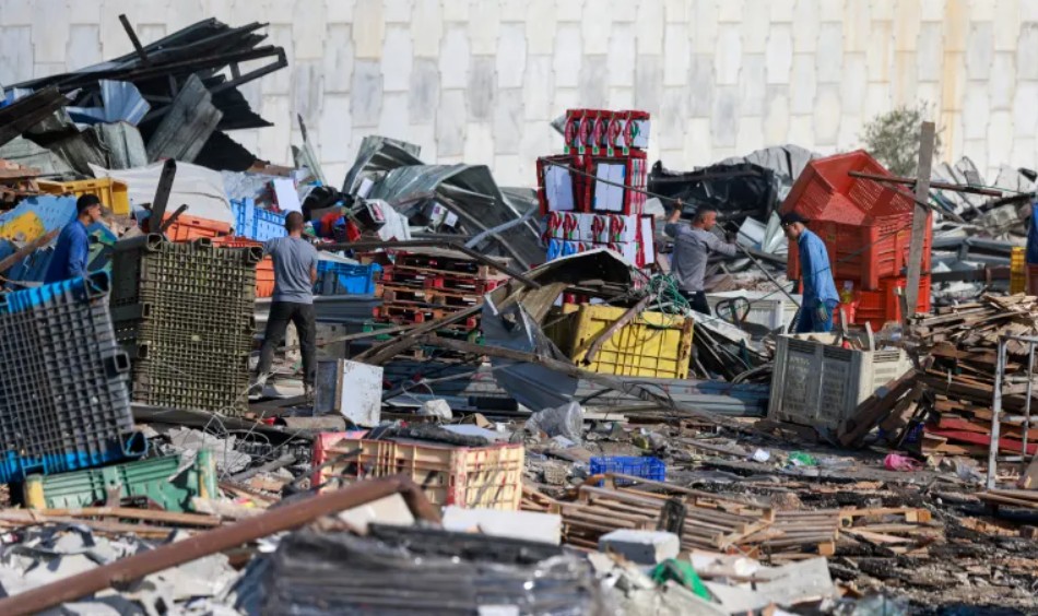 Para pedagang di Baitul Maqdis menyelamatkan barang-barang mereka dari reruntuhan setelah serdadu ‘Israel’ menghancurkan 16 toko di sebuah pasar di Desa Beita, selatan Nablus, Tepi Barat terjajah, 8 September 2025. (Jaafar Ashtiyeh/AFP)