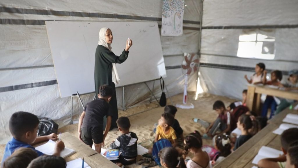 Guru Haneen Karaz menegaskan bahwa pendidikan harus terus berjalan, meski dihancurkan agresi dua tahun terakhir. Ia menyebut kondisi belajar saat ini jauh dari ideal, tetapi perlu.