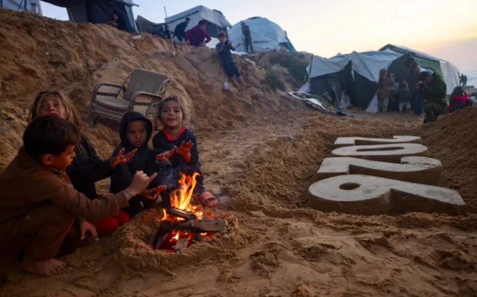 Anak-anak Palestina menghangatkan diri di dekat api unggun di samping pahatan pasir karya seniman Yazed Abo Jarad di Deir el-Balah di Jalur Gaza Tengah. Foto: Arsip AFP
