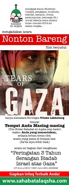 “Tears of Gaza” adalah sebuah film dokumenter yang mengisahkan tentang kehidupan rakyat Gaza saat diserang Israel pada Desember 2008 hingga awal 2009.