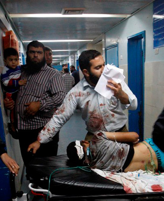 Salah satu korban serangan Zionis tadi malam (11/11) yang luka serius sedang berusaha ditolong oleh keluarganya di rumah sakit. foto: Wafa