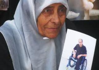 Ibunda Nahedh Al-Aqra’ bersama foto anak yang tak pernah bisa dibesuknya dipenjara sejak hampir 13 tahun yang lalu. foto: IMECM