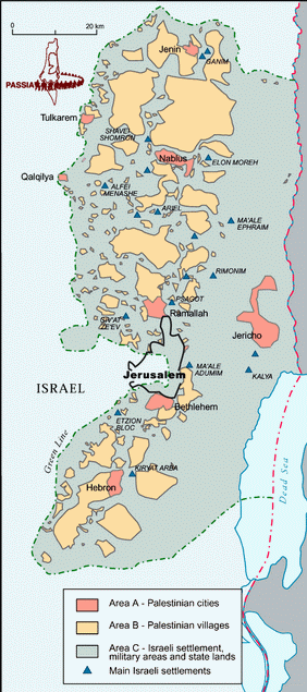 Peta Tepi Barat (West Bank) menurut hasil Perjajian Oslo 1993. Area C adalah wilayah yang berwarna abu-abu, yang dikendalikan oleh Israel, meskipun disebut sebagai bagian dari Palestina yang tersisa. peta: PASSIA (Palestinian Academic Society for the Study of International Affairs