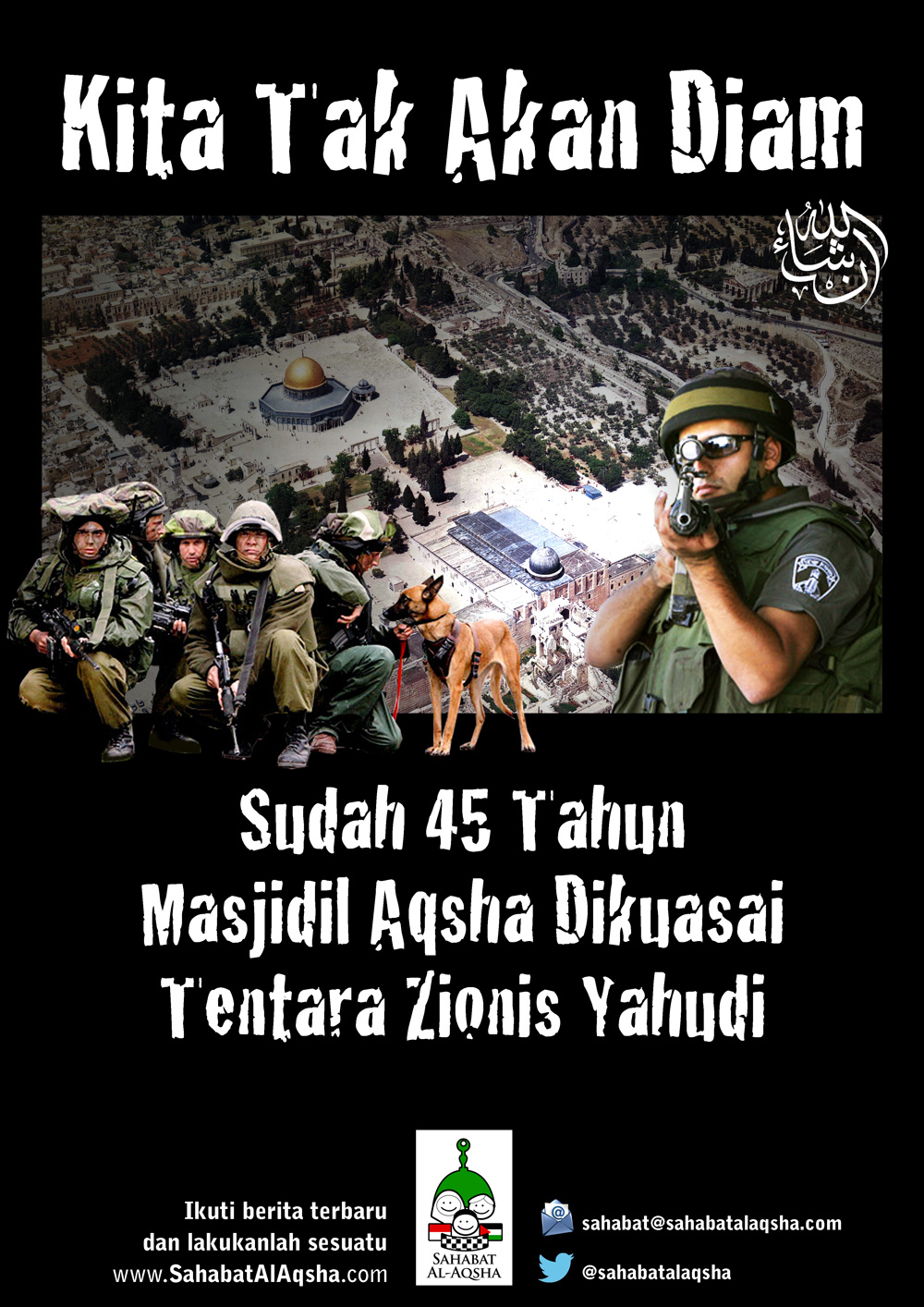 Silakan diklik untuk resolusi lebih besar. Terima kasih sudah berkenan menyebarluaskannya. Semoga Allah membalas dengan kebaikan berlimpah di dunia dan Akhirat. Semoga Allah izinkan kita solat di Masjidil Aqsha dalam keadaan merdeka. (desain poster: Tim Sahabat Al-Aqsha)