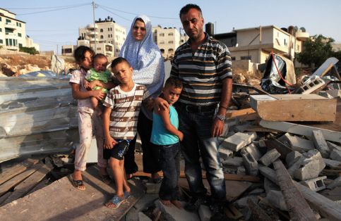 Sebuah keluarga Palestina di depan puing-puing rumah yang susah payah dibangun dan dihancurkan oleh penjajah zionis israel. foto: Electronic Intifada