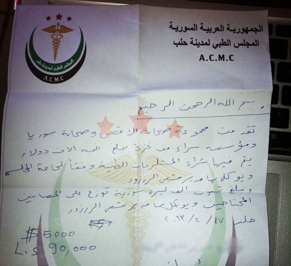 Karena alasan keselamatannya, para staf rumah sakit itu meminta agar nama dokter, nama rumah sakit, dan wajah dokter itu tidak disiarkan. Secara resmi, tanda terima dana tersebut ditulis di atas kop surat ACMC (Aleppo City Medical Council). Ini sebuah dewan yang terdiri dari dokter-dokter dan perawat senior yang bertahan di kota Aleppo membantu korban-korban perang.