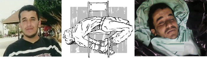 (kiri) Arafat Jaradat, 30 tahun, semasa hidup. Ayah yang sedang menunggu kelahiran bayi keduanya; (tengah) Salah satu teknik penyiksaan yang digunakan Shin Bet terhadap Arafat; (kanan) jenazah Asy-Syahid Arafat Shahin Jaradat. foto: The People Voice, Times of Israel, If American Knew