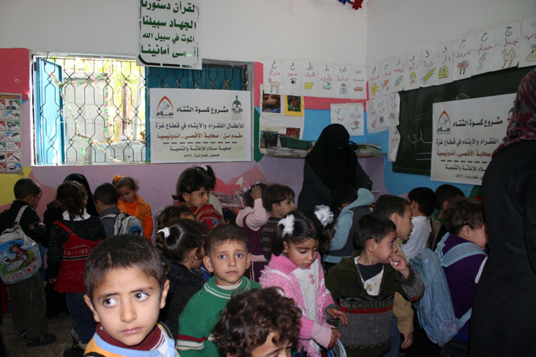 Gelak tawa dan teriakan gembira anak-anak memenuhi ruangan-ruangan di TK Bintang Al-Quran, saat Kepala TK Rajaa’ Al-Hirtsani dan Direktur Yayasan Salam (mitra Sahabat Al-Aqsha) Ya’qub Sulaiman memakaikan beberapa jaket kepada bocah-bocah lucu itu.