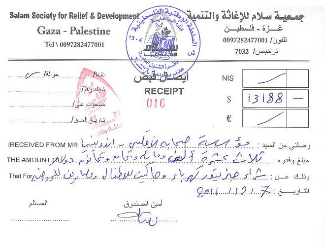 Total dana yang diterima oleh TK Bintang Al-Quran pada tanggal 5 Desember 2011 lalu (melalui rekening Yayasan Salam, Jabaliya, Gaza) adalah Rp121.000.000 atau setara dengan USD13,181 (lihat tanda terima).